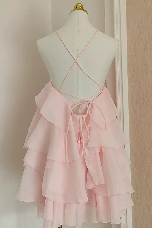 A-Line Boat Neck Spaghetti Straps Appliqeus Chiffon Tiered Homecoming Dress WH1114
