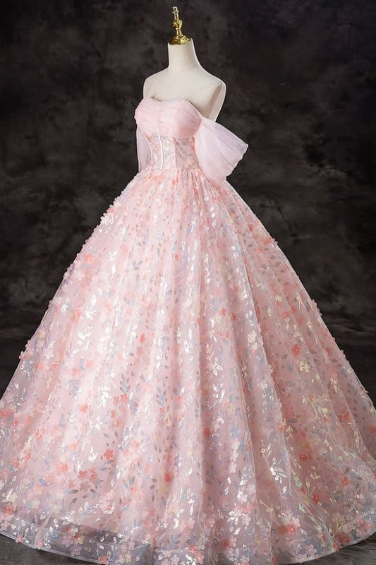 Pink A-Line Strapless Spaghetti Straps 3D Flower Appliques Prom Dress WU1071