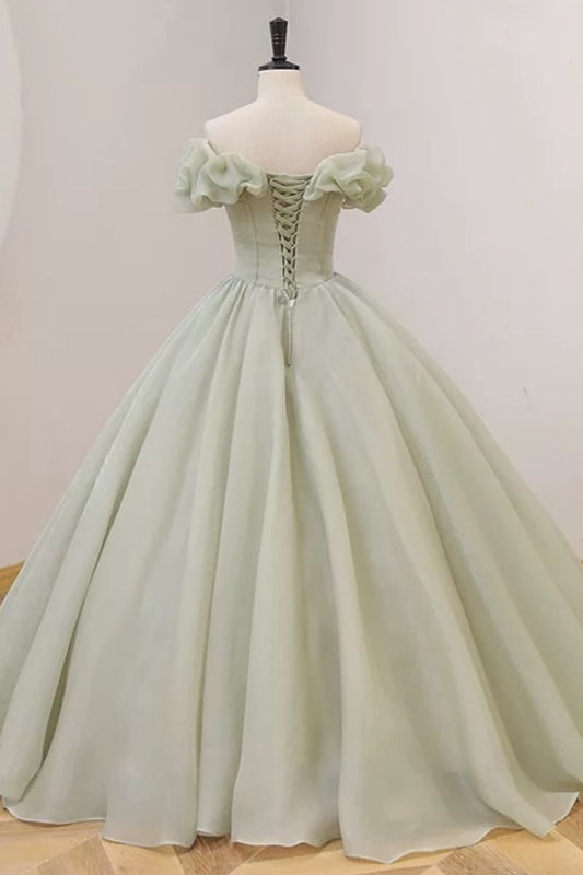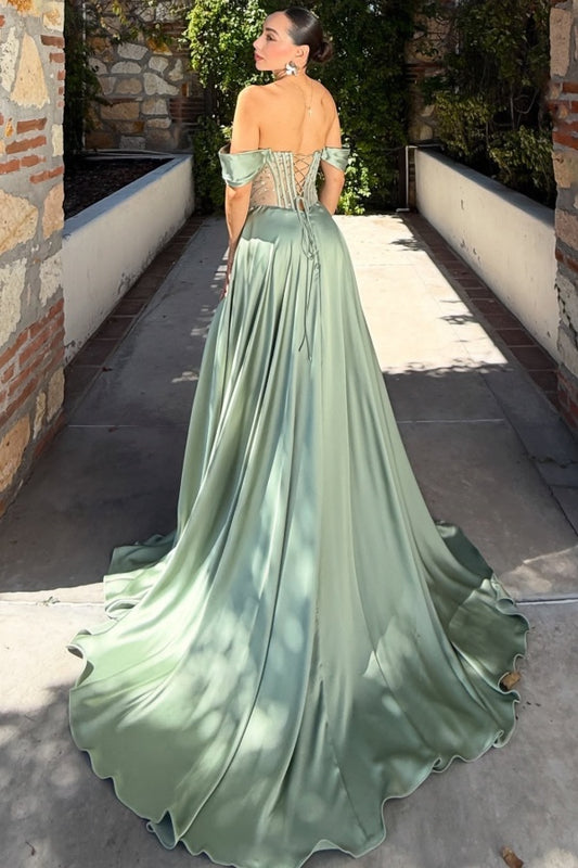 A-Line Off Shoulder Beaded Appliques Ruffles Tiered High Side Slit and Train Prom Dress WU1549