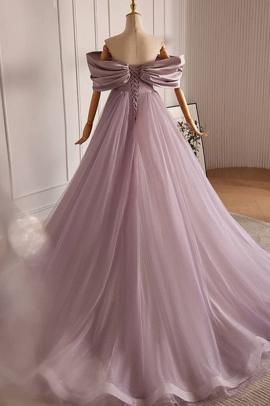 A-Line Strapless Sleeveless Pleated Bow Knot High Side Slit and Train Prom Dress WU1569