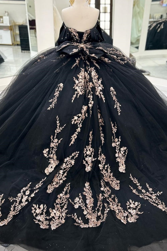 Off Shoulder Sleeveless Beaded Gold Appliques Bow Knot Balck Quinceanera Dress WQ1375