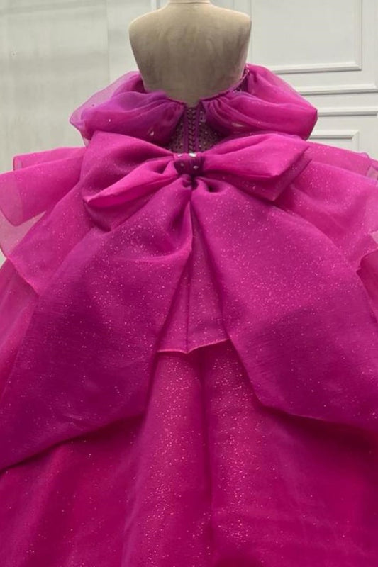Off Shoulder Sleeveless Appliques Beaded Bow Knot Hot Pink Sweet 16 Quinceanera Dress WQ1459