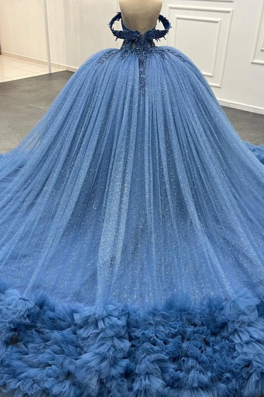 Off Shoulder Sleeveless 3D Flower Appliques Baded Sequins Tiered Blue Quinceanera Dress for Sweet 16 WQ1325
