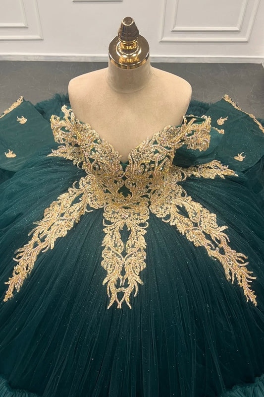 Off Shoulder Sleeveless Gold Appliques Tiered Bow Knot Dark Green Quinceanera Dress for Sweet 16 WQ1326