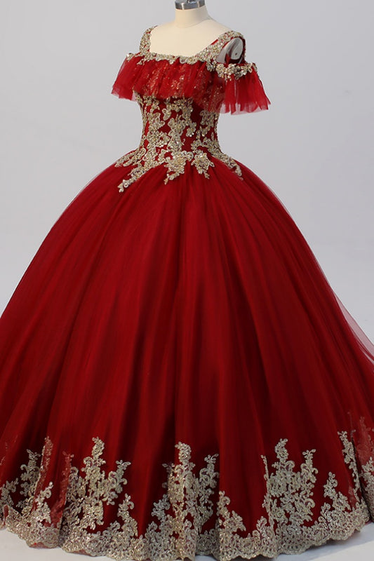 Off Shoulder Sleeveless Beaded Sequins Gold Appliques Bow Knot Red Quinceanera Dress WQ1321