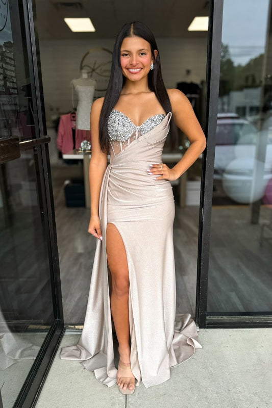 Strapless Sleeveless Beaded Sequins High Side Slit and Train Prom Dress WU1184