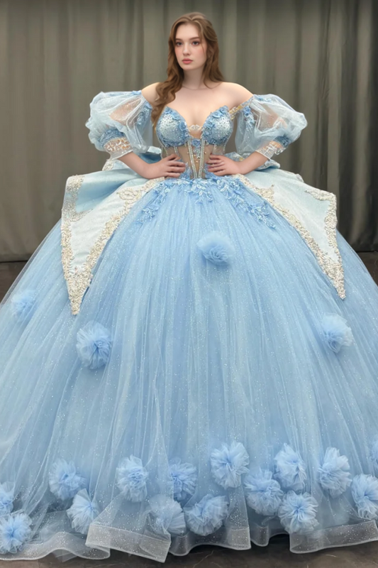 Sweetheart Half Sleeves Beaded 3D Flower Appliques Bow Knot Blue Quinceanera Dress WQ1332