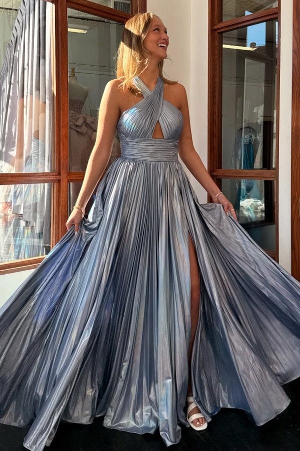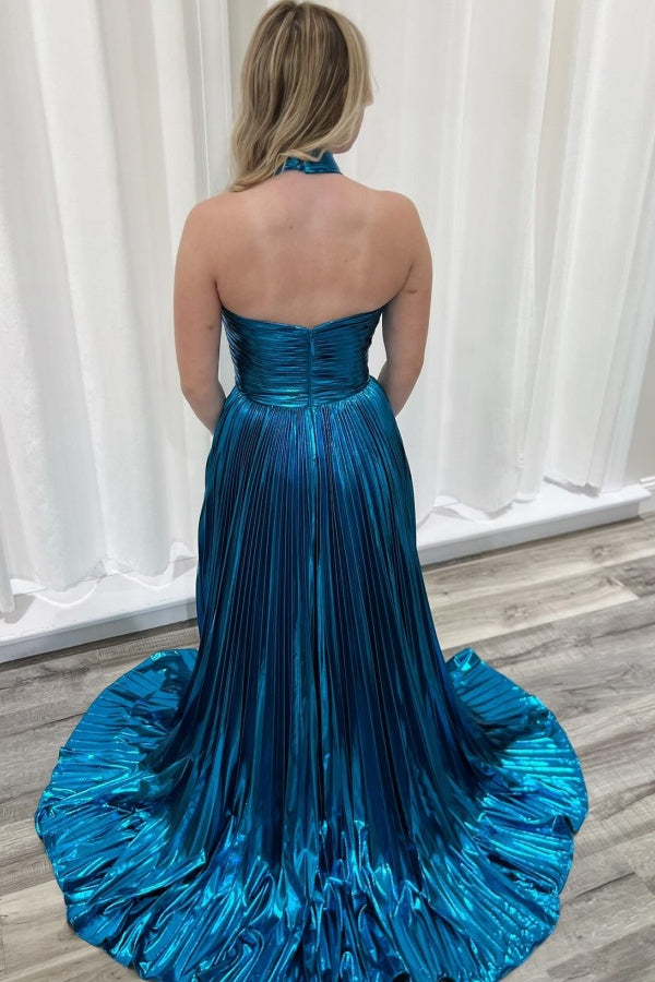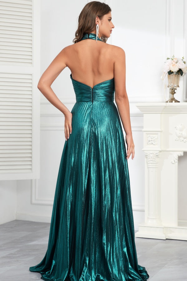 WU1097 - Schlichtes und lässiges A-Linien-Neckholder-Kleid, ärmellos, plissiert, Ball- und Partykleid, offener Rücken, hoher Seitenschlitz, formelles Abendkleid, Hochzeitsgastkleid, Cocktailkleid