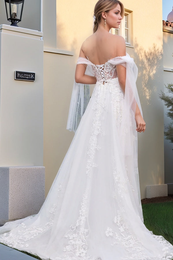 WW1010 - Elegantes und hinreißendes A-Linien-Brautkleid aus schulterfreiem, ärmellosem, plissiertem Satin mit hohem Seitenschlitz und Hofschleppe