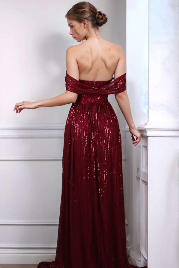 WU1130 - Wunderschönes schulterfreies ärmelloses Ball- und Partykleid mit Pailletten, hohem Seitenschlitz und Schleppe, Abendkleid, Cocktailkleid