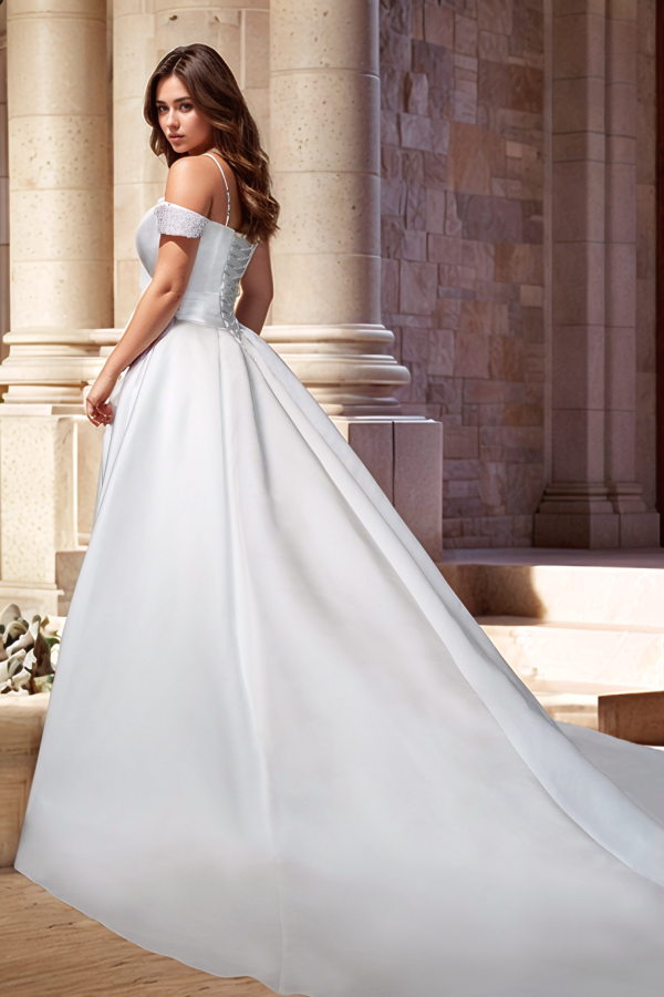 Verschönern Sie Ihren Brautlook mit dem Hochzeitskleid WW1010. Die elegante A-Linien-Silhouette, der schulterfreie Ausschnitt und das ärmellose Design sorgen für einen zeitlosen und eleganten Look. Der plissierte Satinstoff verleiht einen Hauch von Luxus, während der hohe Seitenschlitz und die Schleppe einen modernen Touch verleihen. Vervollständigen Sie Ihren Look mit dem wunderschönen Schleifendetail.