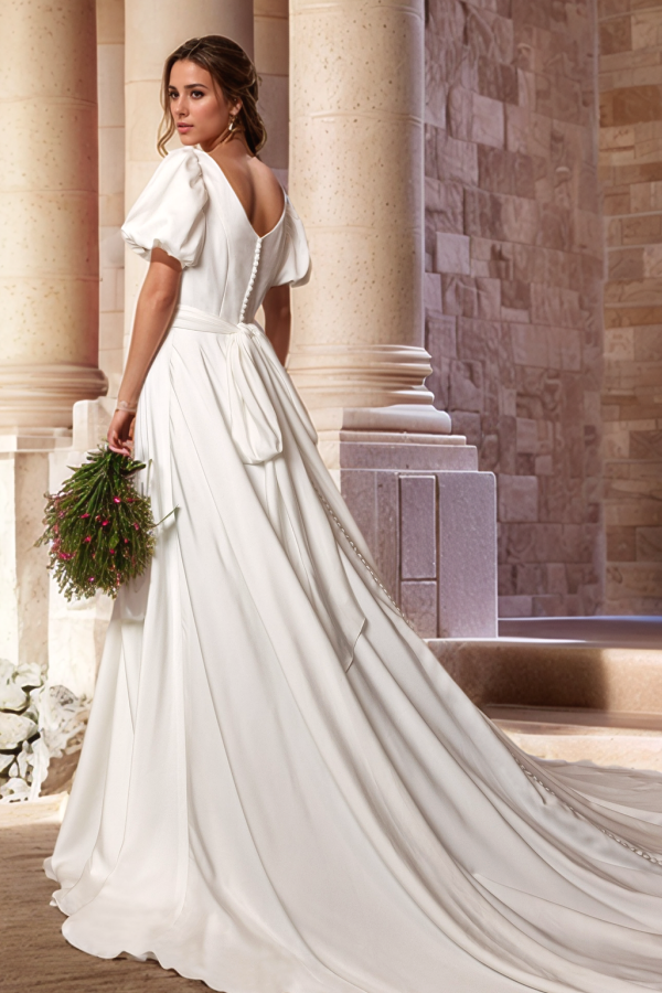 Verschönern Sie Ihren Brautlook mit dem Hochzeitskleid WW1010. Die elegante A-Linien-Silhouette, der schulterfreie Ausschnitt und das ärmellose Design sorgen für einen zeitlosen und eleganten Look. Der plissierte Satinstoff verleiht einen Hauch von Luxus, während der hohe Seitenschlitz und die Schleppe einen modernen Touch verleihen. Vervollständigen Sie Ihren Look mit dem wunderschönen Schleifendetail.