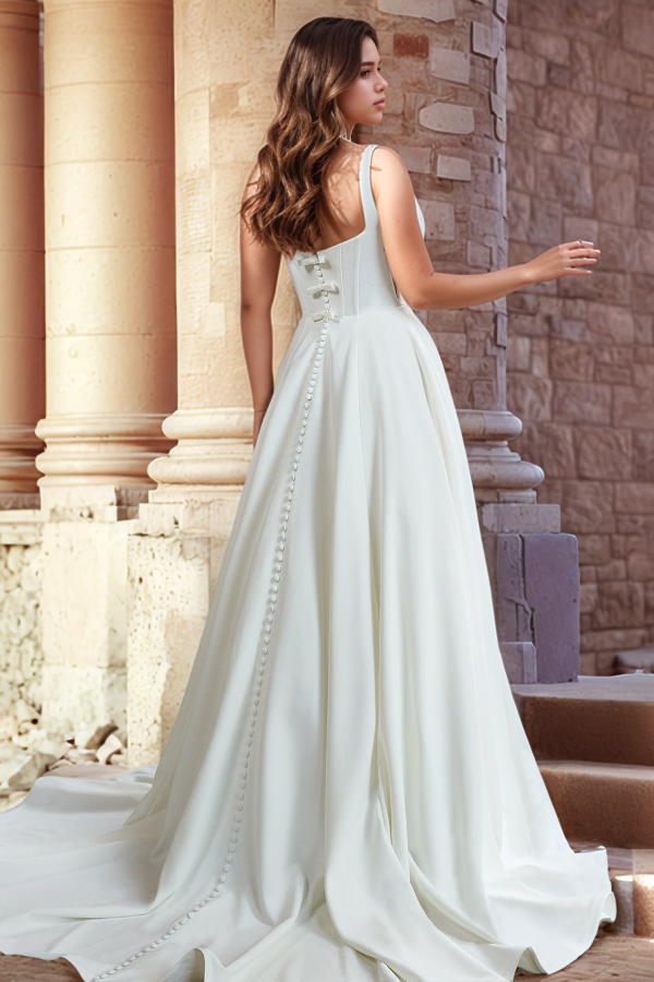 Verschönern Sie Ihren Brautlook mit dem Hochzeitskleid WW1010. Die elegante A-Linien-Silhouette, der schulterfreie Ausschnitt und das ärmellose Design sorgen für einen zeitlosen und eleganten Look. Der plissierte Satinstoff verleiht einen Hauch von Luxus, während der hohe Seitenschlitz und die Schleppe einen modernen Touch verleihen. Vervollständigen Sie Ihren Look mit dem wunderschönen Schleifendetail.
