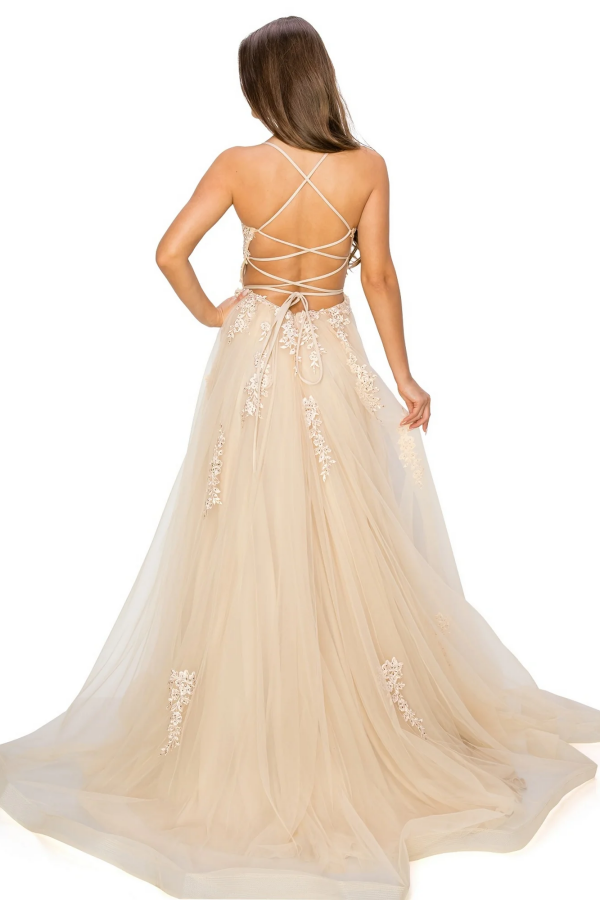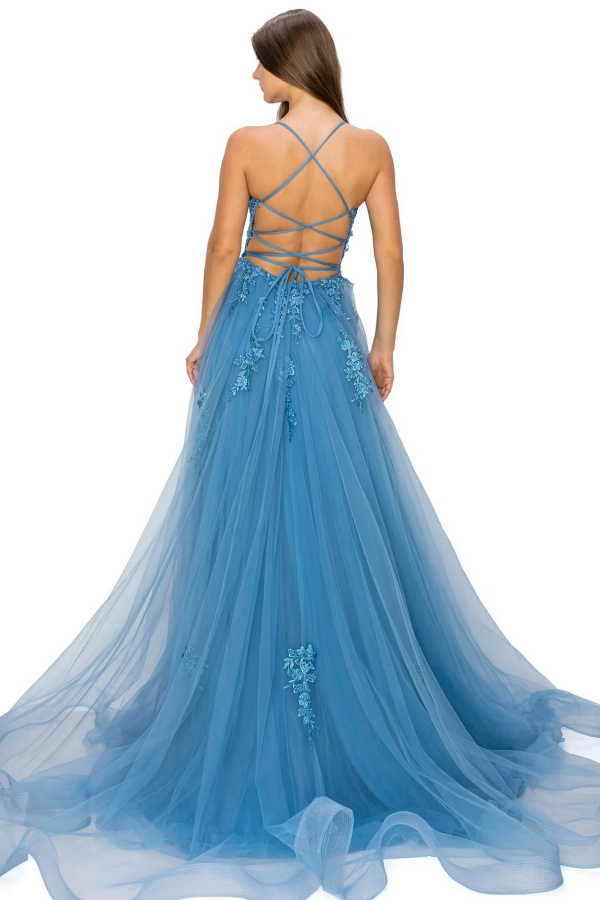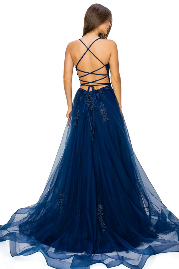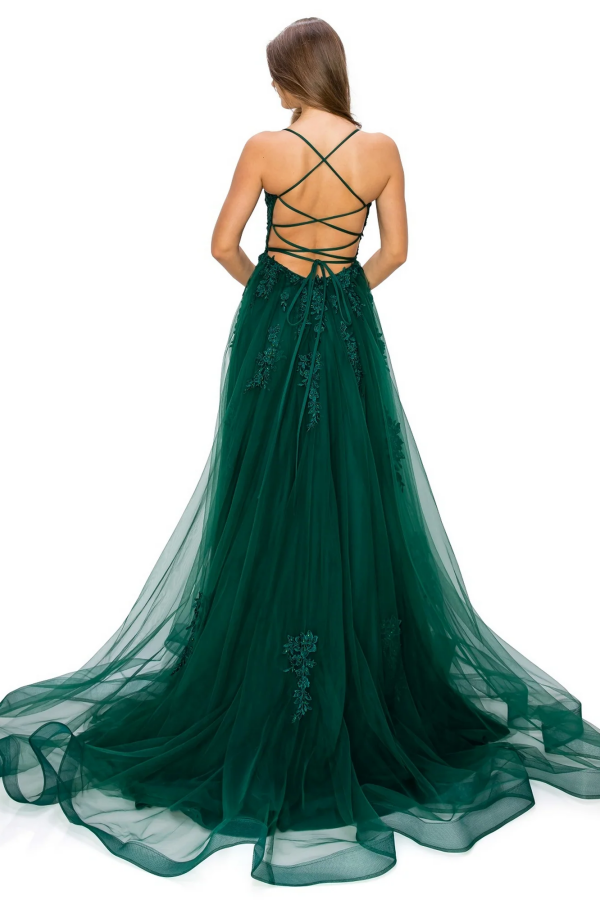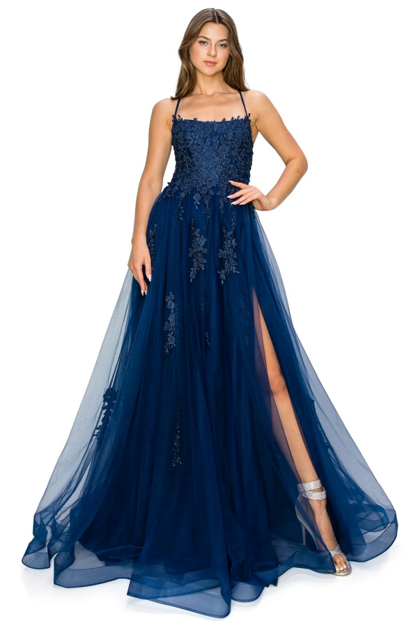 Dieses wunderschöne Ballkleid hat eine schmeichelhafte A-Linien-Silhouette mit quadratischen Spaghettiträgern und aufwendigen Applikationen. Die überkreuzten Träger und der hohe Seitenschlitz verleihen diesem vielseitigen Abendkleid einen Hauch von Eleganz, perfekt für Hochzeiten und andere besondere Anlässe.
