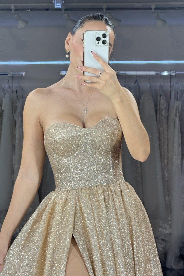 WU1061 - Glitzerndes und schlichtes A-Linien-Abendkleid, trägerlos, ärmellos, goldenes Ballkleid, hoher Seitenschlitz und Schleppe, Hochzeitsgastkleid