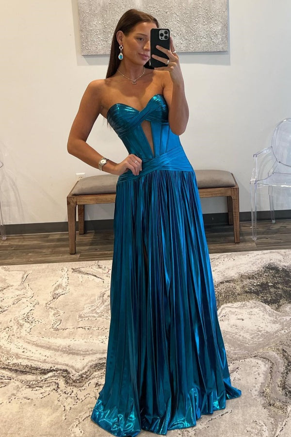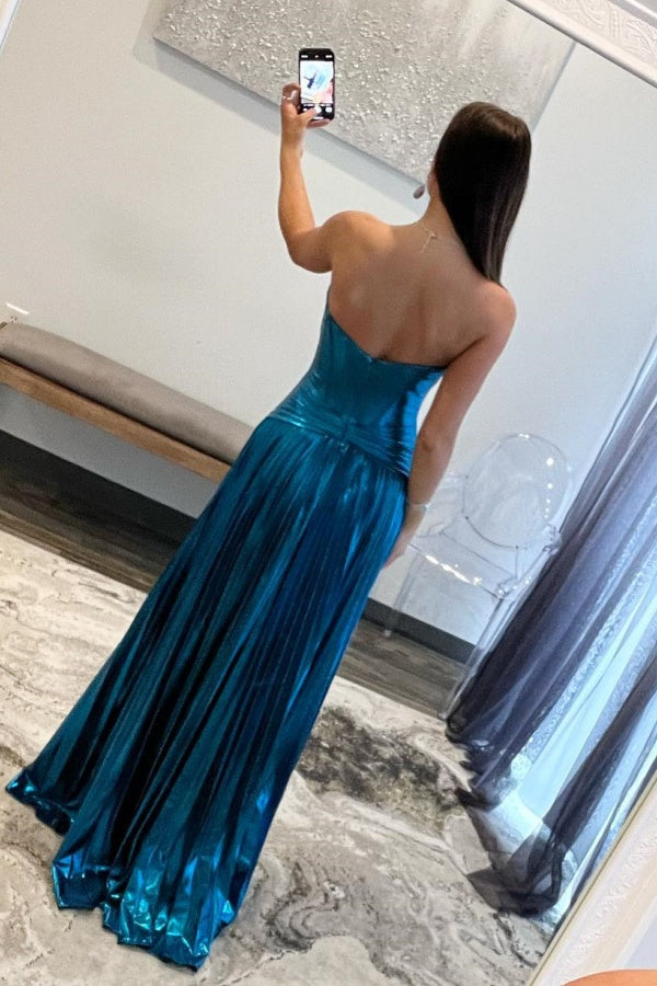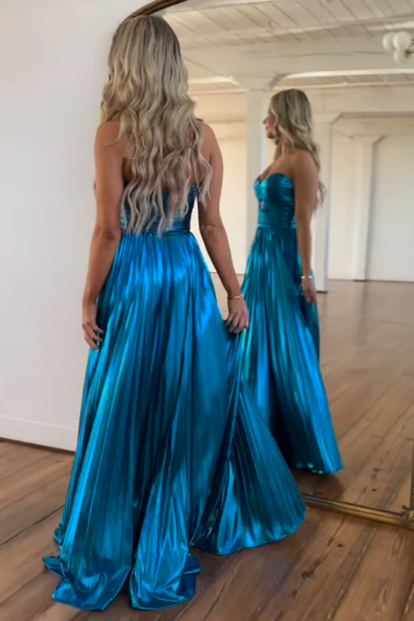 WU1116 - Lässiges und schlichtes A-Linien-Abendkleid, trägerlos, ärmellos, plissiert, bodenlang, mit hohem Seitenschlitz