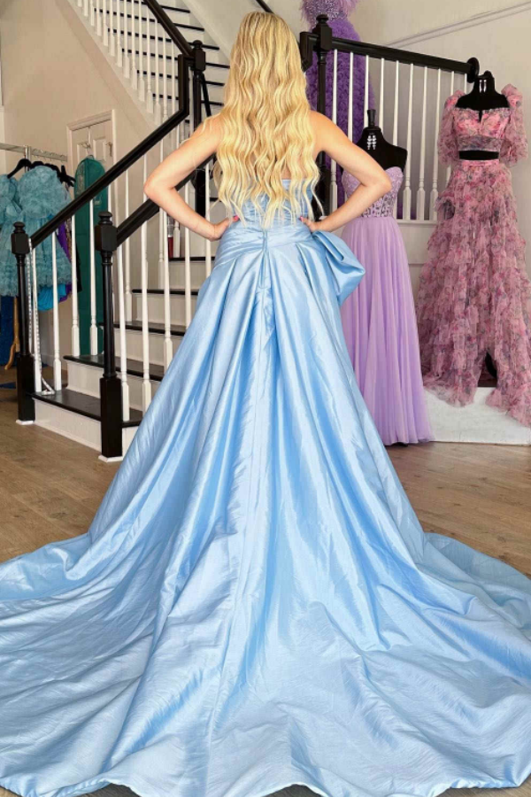 WU1080 - Schlichtes und lässiges A-Linien-Kleid, trägerlos, ärmellos, himmelblau, formelles Ballkleid, Hofschleppe, bodenlanges Abendkleid, Partykleid, Hochzeitsgastkleid