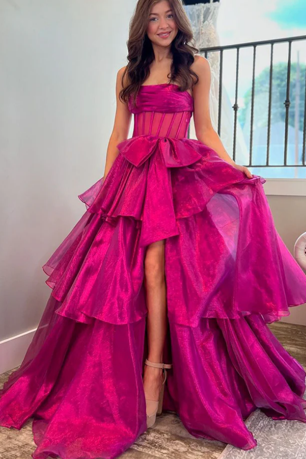 WU1118 - Sexy & süßes A-Linien-Kleid, trägerlos, ärmellos, Tüll, gestuftes Party-/Ballkleid, hoher Seitenschlitz, Schleife, Knoten, Abendkleid, formelles Kleid für Hochzeitsgäste