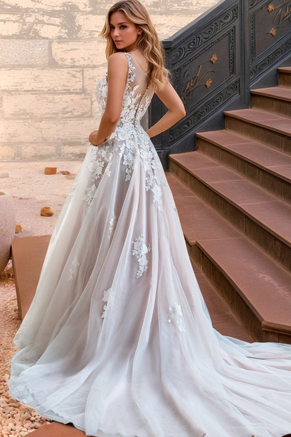 WW1010 - Elegantes und hinreißendes A-Linien-Brautkleid aus schulterfreiem, ärmellosem, plissiertem Satin mit hohem Seitenschlitz und Hofschleppe