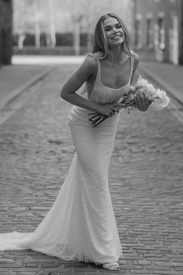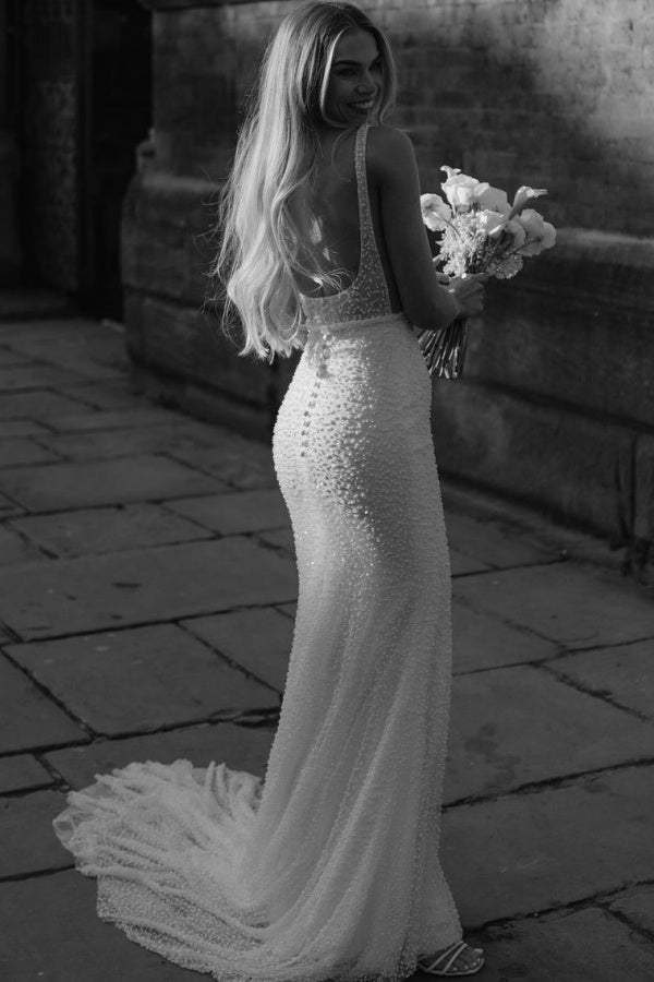 WW1010 - Elegantes und hinreißendes A-Linien-Brautkleid aus schulterfreiem, ärmellosem, plissiertem Satin mit hohem Seitenschlitz und Hofschleppe