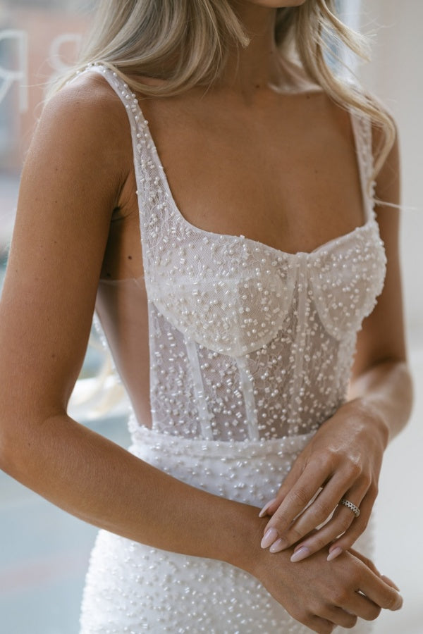 Verschönern Sie Ihren Brautlook mit dem Hochzeitskleid WW1010. Die elegante A-Linien-Silhouette, der schulterfreie Ausschnitt und das ärmellose Design sorgen für einen zeitlosen und eleganten Look. Der plissierte Satinstoff verleiht einen Hauch von Luxus, während der hohe Seitenschlitz und die Schleppe einen modernen Touch verleihen. Vervollständigen Sie Ihren Look mit dem wunderschönen Schleifendetail.