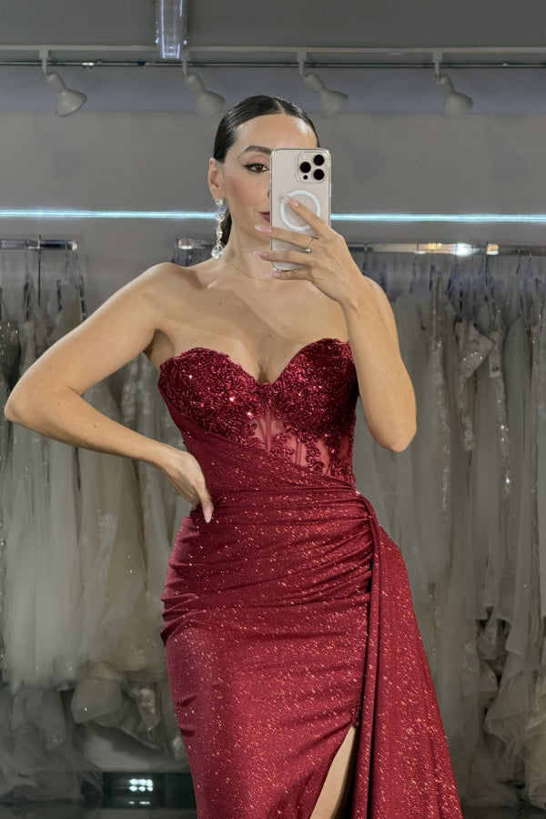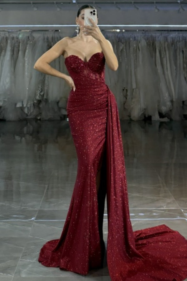 WU1066 - Glitzerndes Meerjungfrauen-Abendkleid, trägerlos, ärmellos, mit Applikationen, plissiert, bodenlang, burgunderfarben, formelles Partykleid, Cocktailkleid