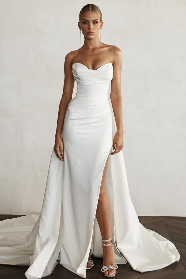 WW1010 - Elegantes und hinreißendes A-Linien-Brautkleid aus schulterfreiem, ärmellosem, plissiertem Satin mit hohem Seitenschlitz und Hofschleppe
