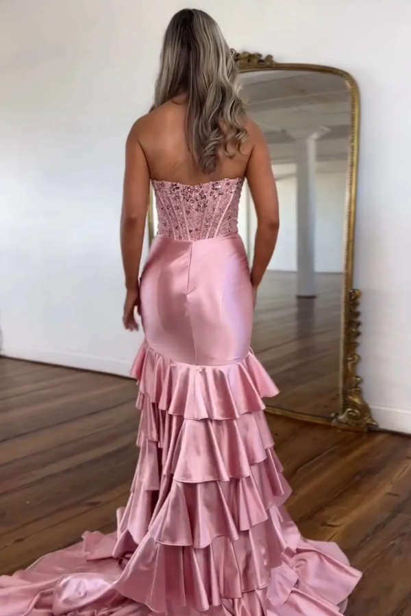 Seien Sie der Star jeder Veranstaltung mit unserem atemberaubenden trägerlosen Sweet & Cute Mermaid-Partykleid. Mit seinem plissierten Design, den glitzernden Pailletten und einem gestuften hohen Seitenschlitz ist dieses Kleid ein echter Hingucker. Seine Schleppe und die Bodenlänge verleihen ihm eine elegante Note. Perfekt für den Abschlussball oder jeden anderen besonderen Anlass.