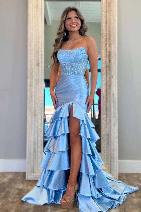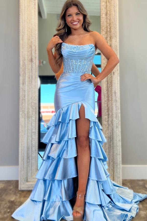 WU1036 - Süßes und niedliches Meerjungfrauen-Kleid, trägerlos, ärmellos, plissiert, mit Pailletten, gestuftem hohem Seitenschlitz und Schleppe, bodenlanges Partykleid, Ballkleid