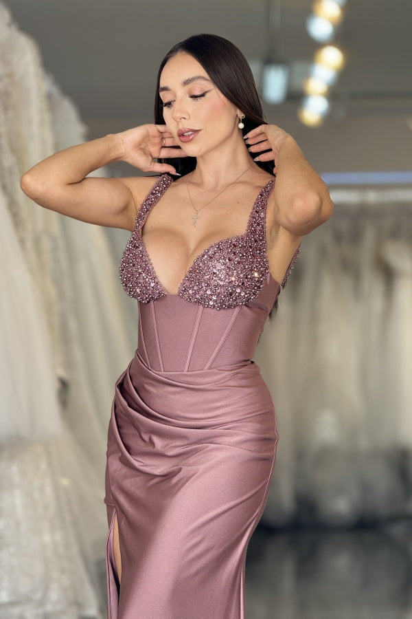 WU1062 - Süßes und elegantes Meerjungfrau-Abendkleid, trägerlos, ärmellos, bodenlang, formelles Partykleid, mit Perlen besetzt, plissiert, altrosa Satin, mit Schleppe