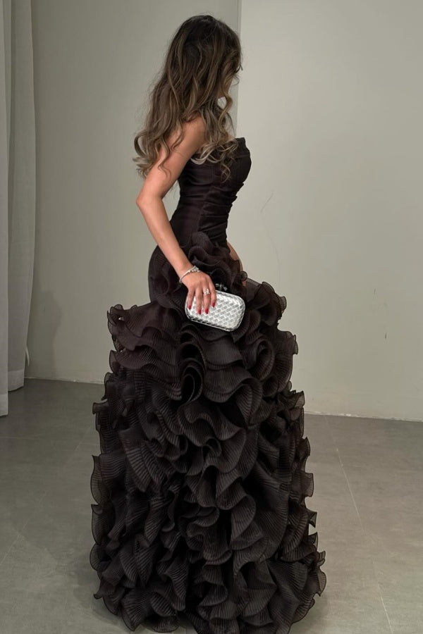 WU1087 - Schickes und modernes Meerjungfrauen-Kleid, trägerlos, ärmellos, Tüll, gestuftes Ball- und Partykleid, schwarz, bodenlang, formelles Abendkleid, Cocktailkleid