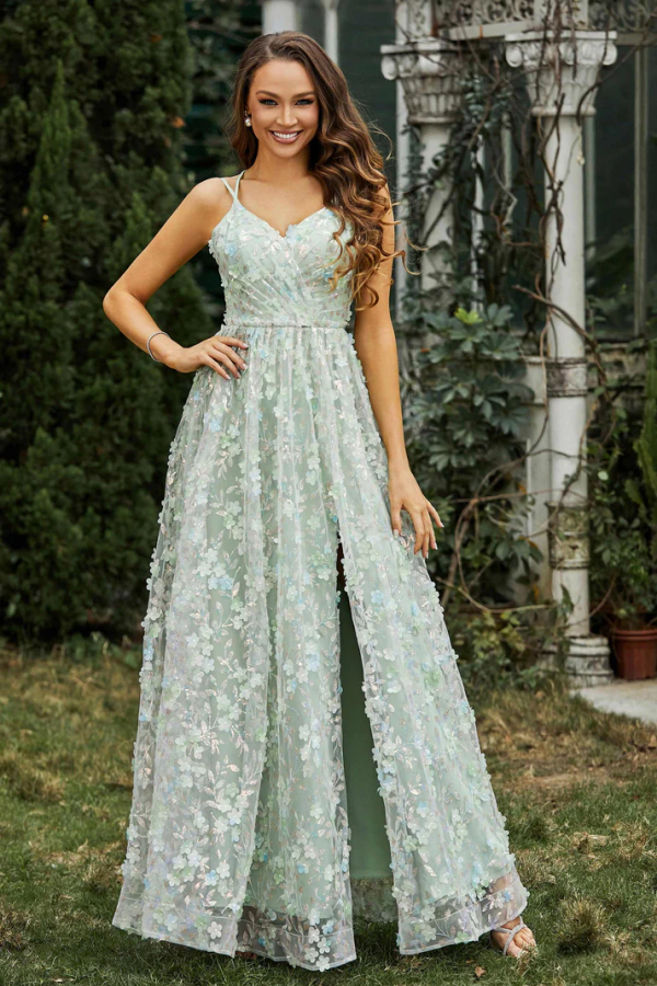 WU1074 - Schickes und modernes mintgrünes A-Linien-Kleid mit trägerlosen Spaghettiträgern, ärmellos, Ball- und Partykleid, 3D-Blumentüll, hoher Seitenschlitz, offener Rücken, Abendkleid, Hochzeitsgastkleid