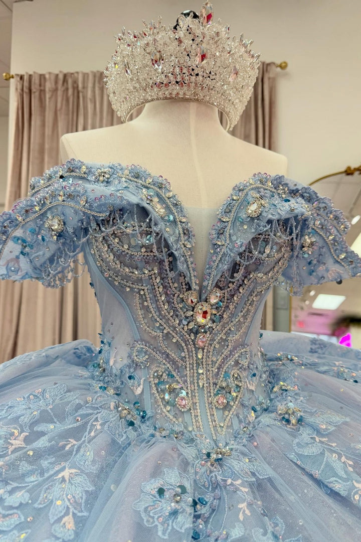 Description: This blue quinceañera dress showcases an elegant off-shoulder and sleeveless design adorned with intricately beaded appliques. A charming bow knot detail adds a touch of sophistication to the silhouette, combining classic style with modern craftsmanship. Perfect for celebrating your Sweet 15 milestone, this gown offers a refined fit that highlights your poise and grace on your special day.