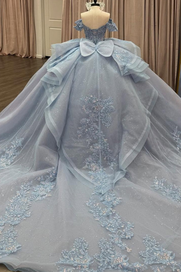 Off Shoulder Sleeveless Beaded Appliques Bow Knot Blue Sweet 15 Quinceañera Dress WQ1664