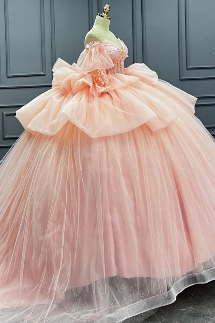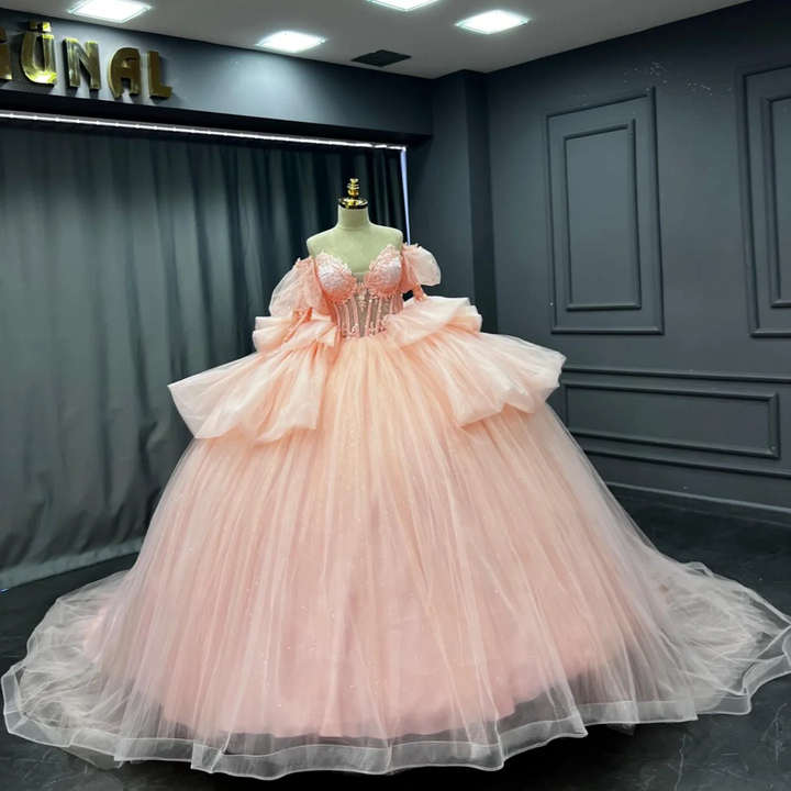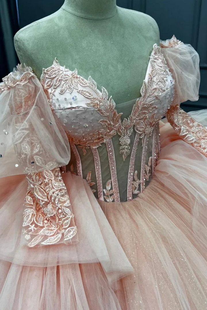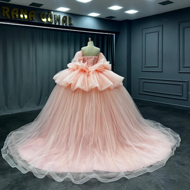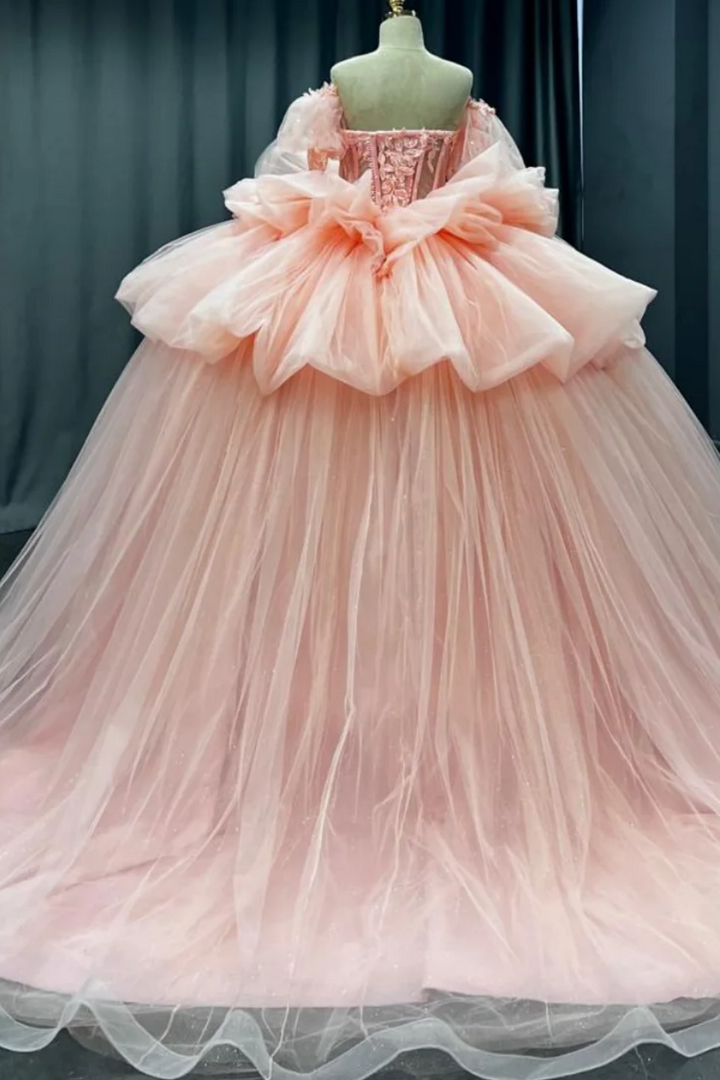 Langes Quinceanera-Kleid mit Herzausschnitt für Damen, trägerloses Korsett mit Blumenapplikationen, Perlenbesetztes Tüll-Ballkleid