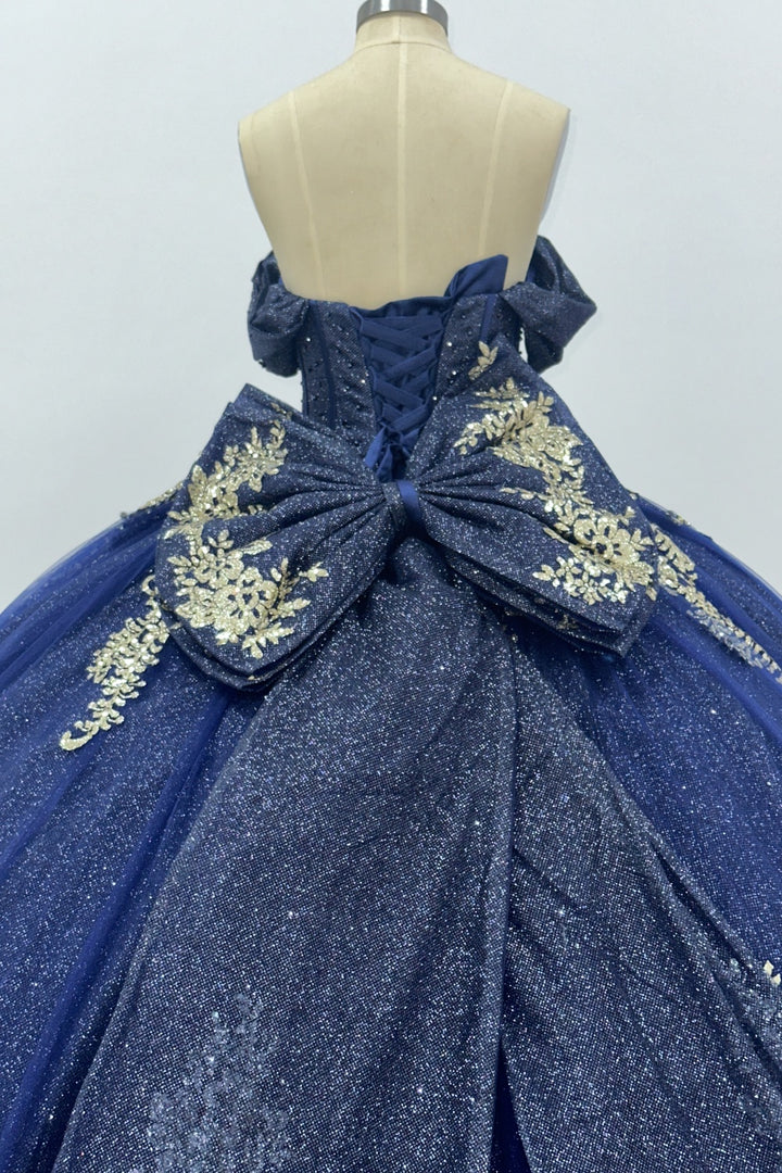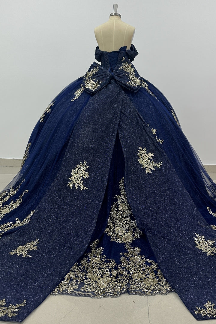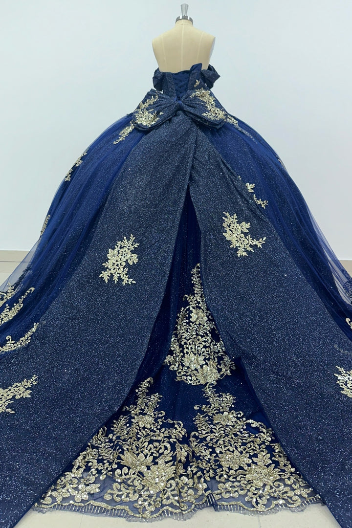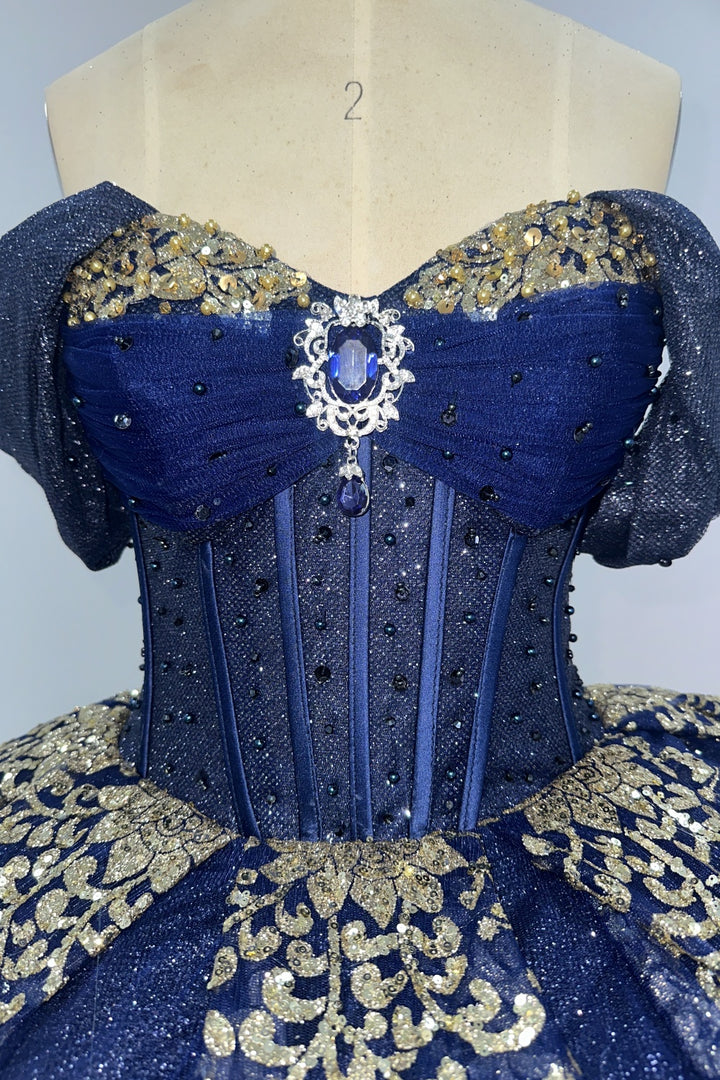 • Merkmale des Quinceanera-Kleides: Langes Ballkleid mit Blumenapplikationen und trägerlosem Korsett, verziert mit metallischen Stickereien und Kristallperlen; der volle Glitzertüllrock wurde passend dazu akzentuiert und verfügt über eine geformte Überlage und eine Kathedralenschleppe.