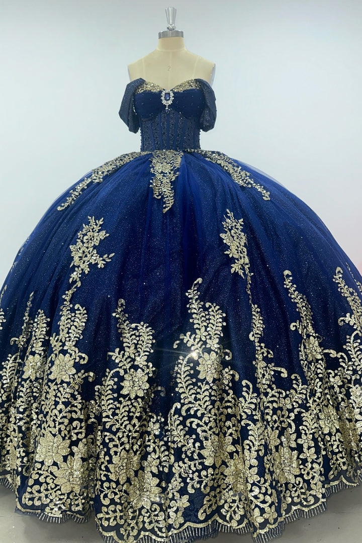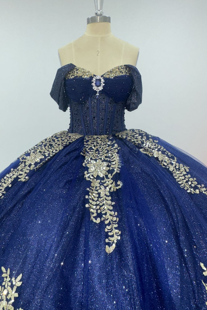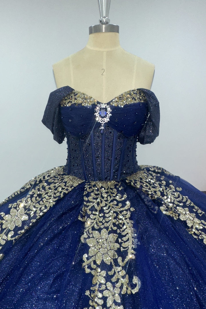 Langes Quinceanera-Kleid mit Herzausschnitt für Damen, trägerloses Korsett mit Blumenapplikationen, Perlenbesetztes Tüll-Ballkleid