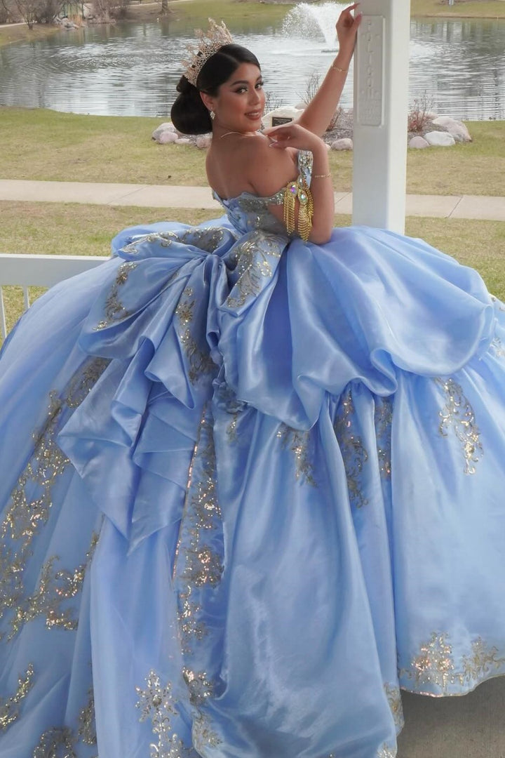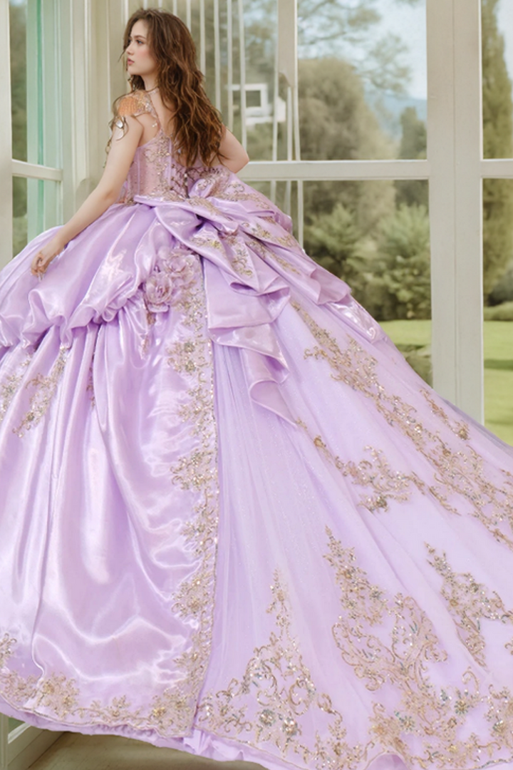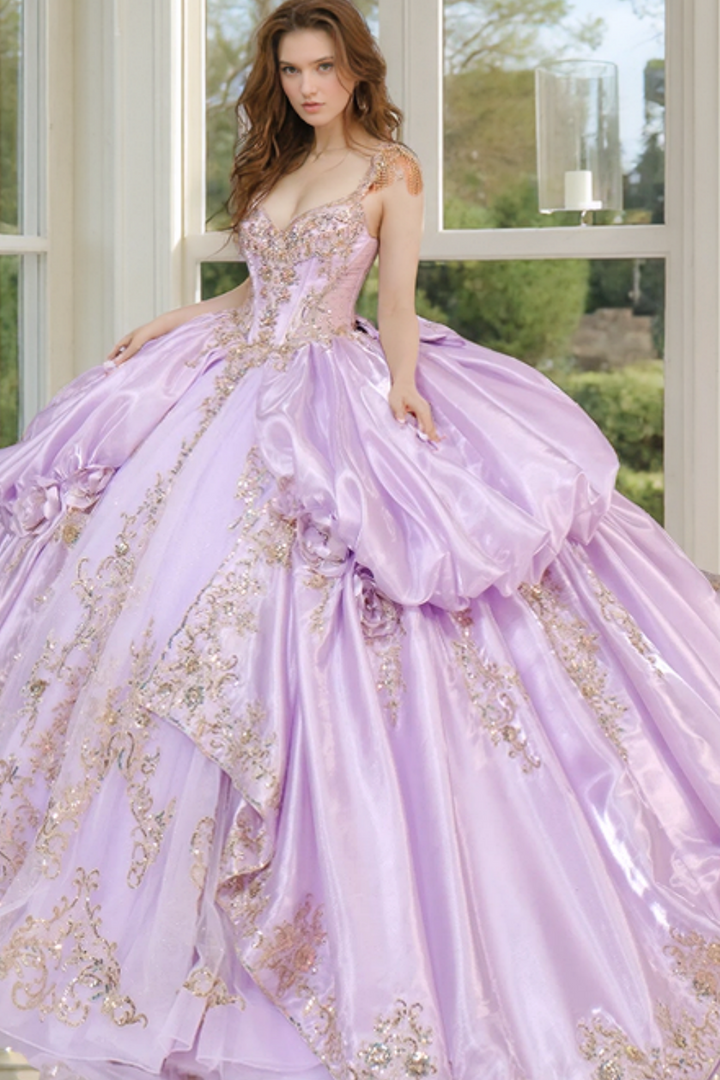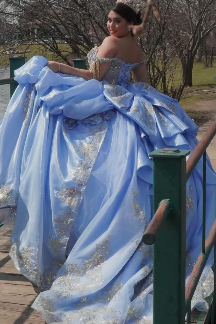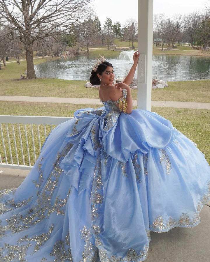 • Merkmale des Quinceanera-Kleides: Langes Ballkleid mit Blumenapplikationen und trägerlosem Korsett, verziert mit metallischen Stickereien und Kristallperlen; der volle Glitzertüllrock wurde passend dazu akzentuiert und verfügt über eine geformte Überlage und eine Kathedralenschleppe.