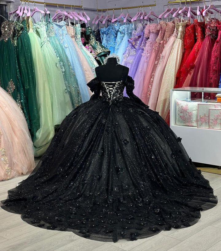 Schwarzes schulterfreies Sweetheart-Prinzessin-Quinceanera-Kleid mit langen Ärmeln, Blumenapplikationen, Glitzer-Tüll, Abschlussball-Partykleider, Sweet 16-Kleid