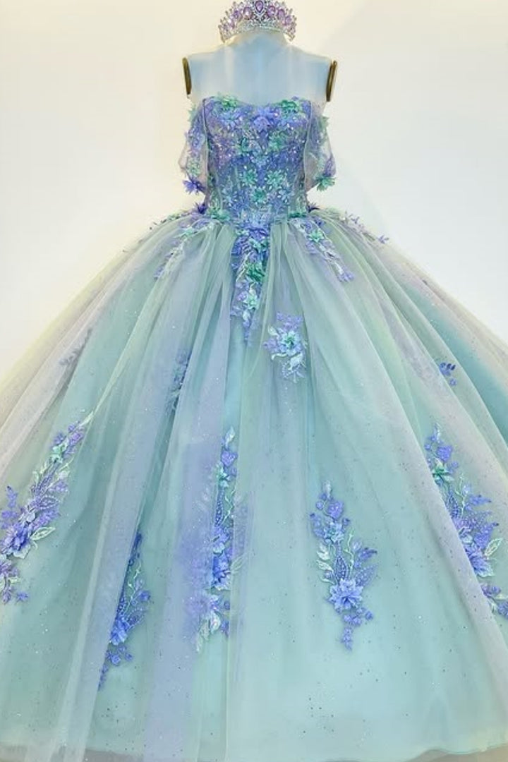 Langes Quinceanera-Kleid mit Herzausschnitt für Damen, trägerloses Korsett mit Blumenapplikationen, Perlenbesetztes Tüll-Ballkleid