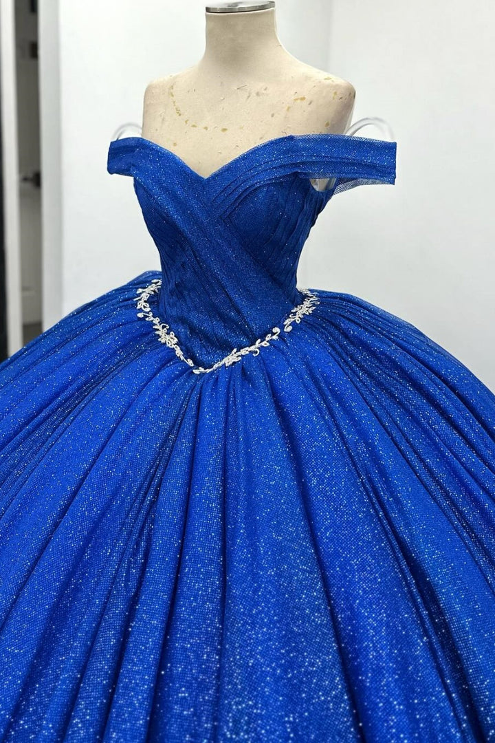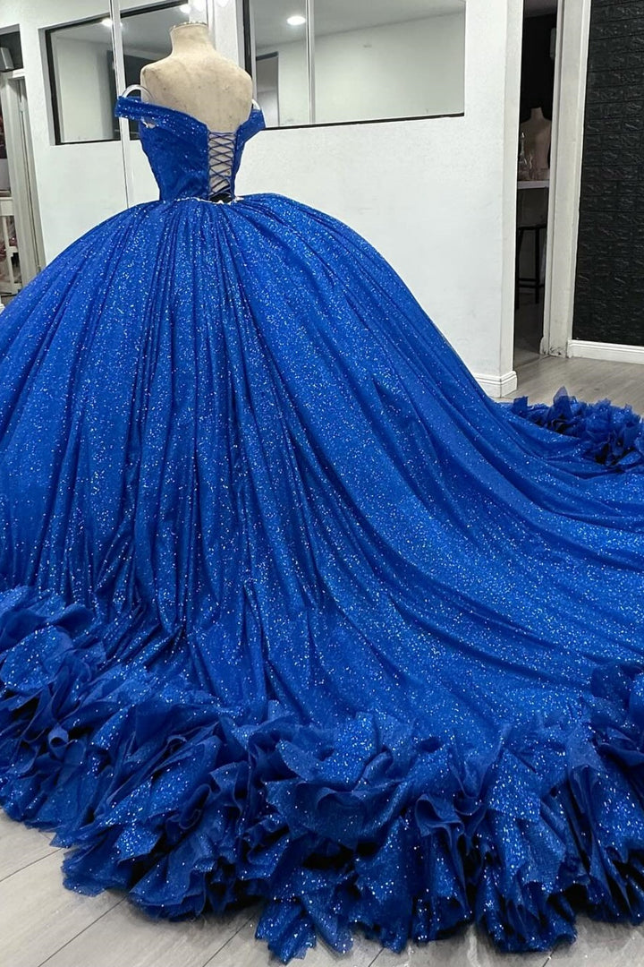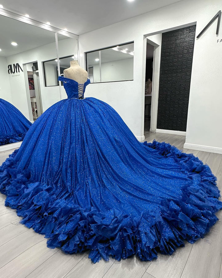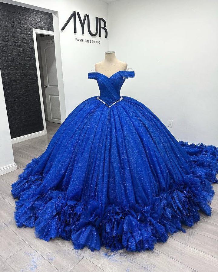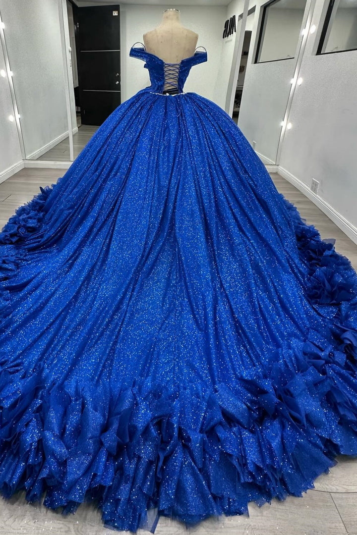 • Merkmale des Quinceanera-Kleides: Langes Ballkleid mit Blumenapplikationen und trägerlosem Korsett, verziert mit metallischen Stickereien und Kristallperlen; der volle Glitzertüllrock wurde passend dazu akzentuiert und verfügt über eine geformte Überlage und eine Kathedralenschleppe.