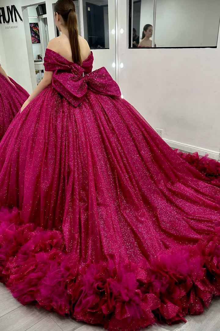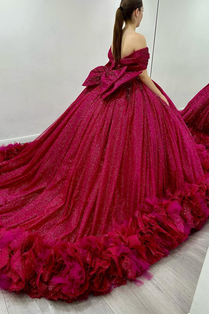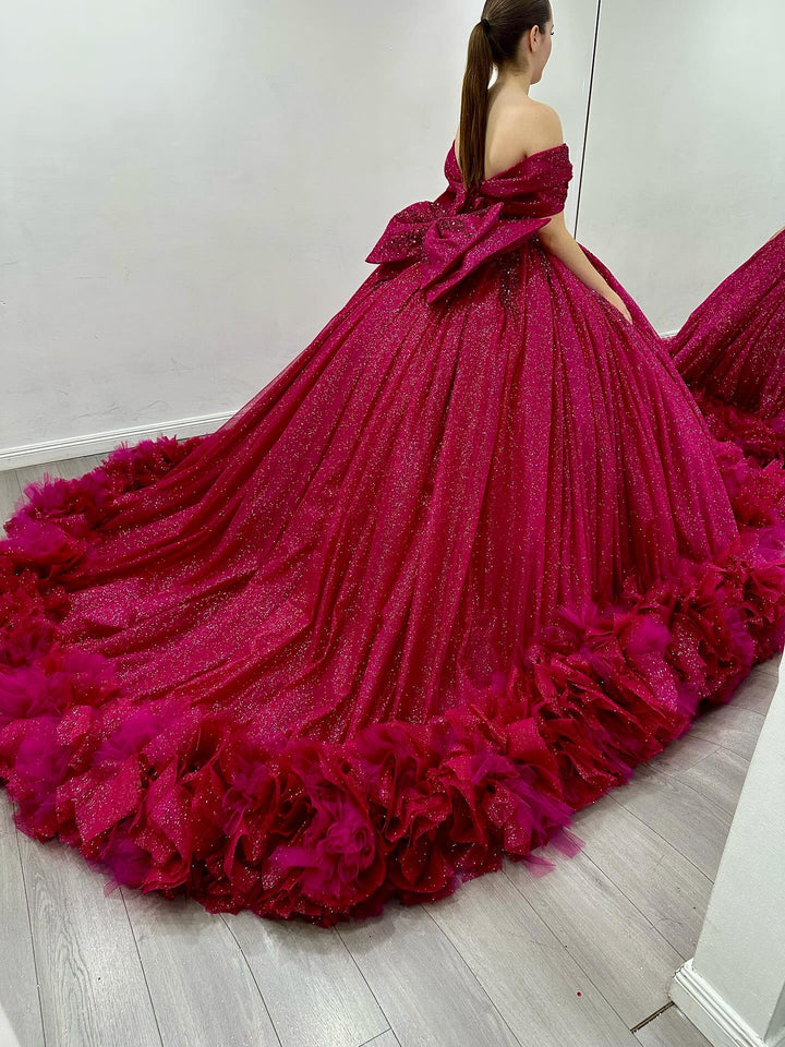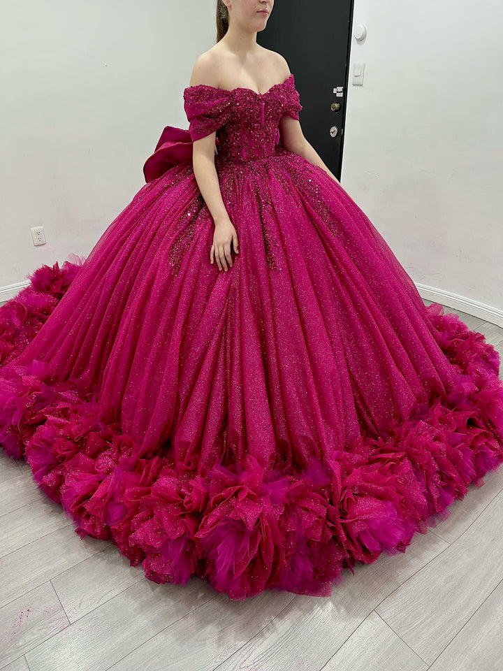 • Merkmale des Quinceanera-Kleides: Langes Ballkleid mit Blumenapplikationen und trägerlosem Korsett, verziert mit metallischen Stickereien und Kristallperlen; der volle Glitzertüllrock wurde passend dazu akzentuiert und verfügt über eine geformte Überlage und eine Kathedralenschleppe.