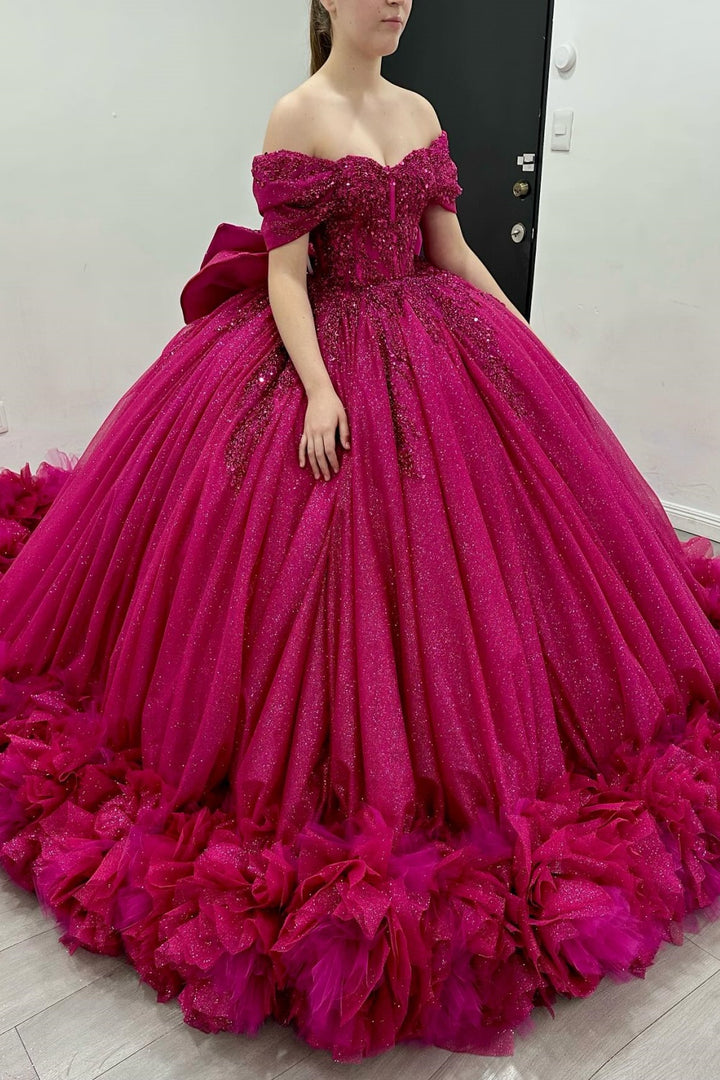 Langes Quinceanera-Kleid mit Herzausschnitt für Damen, trägerloses Korsett mit Blumenapplikationen, Perlenbesetztes Tüll-Ballkleid