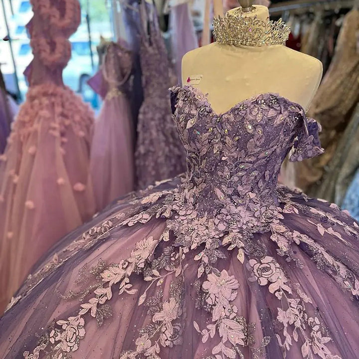 Glitzerndes schulterfreies Ballkleid mit herzförmigem Ausschnitt und Blumenapplikationen, Spitze, Perlenbesatz, Korsett, Geburtstags- und Abschlussballkleider, süßes 16-Kleid