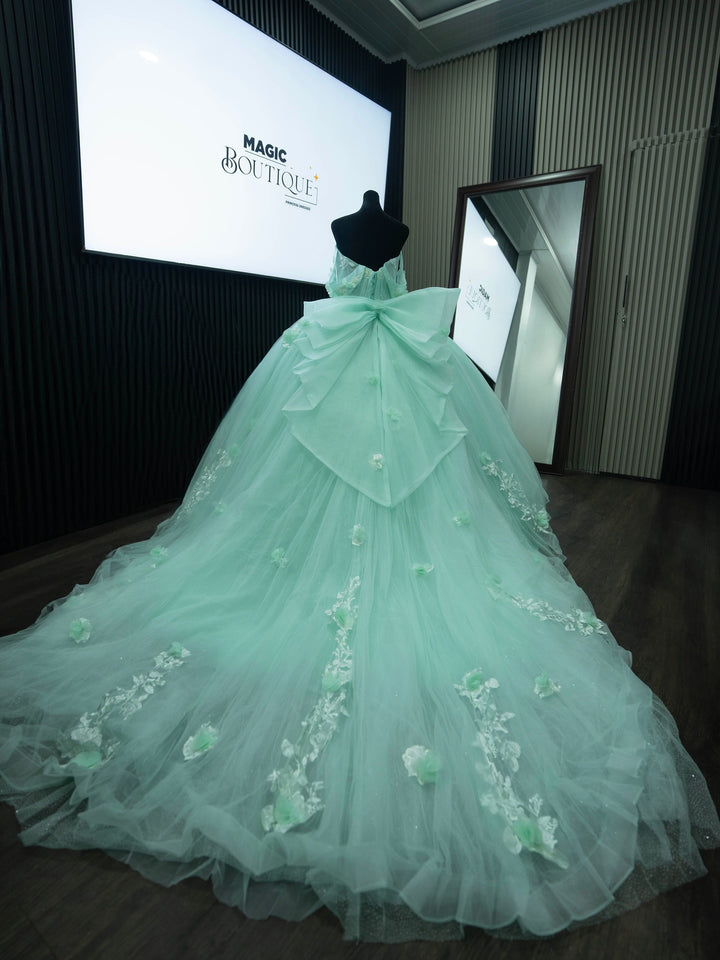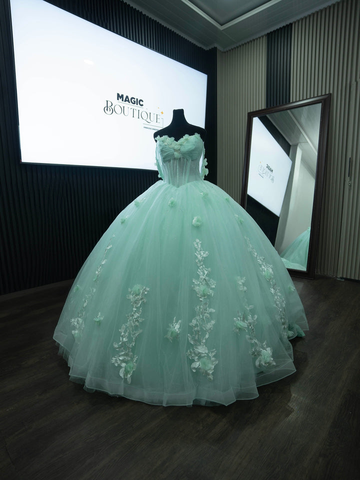 • Merkmale des Quinceanera-Kleides: Langes Ballkleid mit Blumenapplikationen und trägerlosem Korsett, verziert mit metallischen Stickereien und Kristallperlen; der volle Glitzertüllrock wurde passend dazu akzentuiert und verfügt über eine geformte Überlage und eine Kathedralenschleppe.