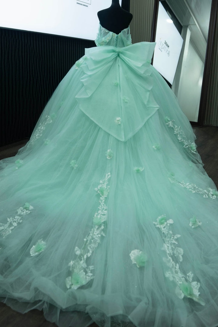 Langes Quinceanera-Kleid mit Herzausschnitt für Damen, trägerloses Korsett mit Blumenapplikationen, Perlenbesetztes Tüll-Ballkleid