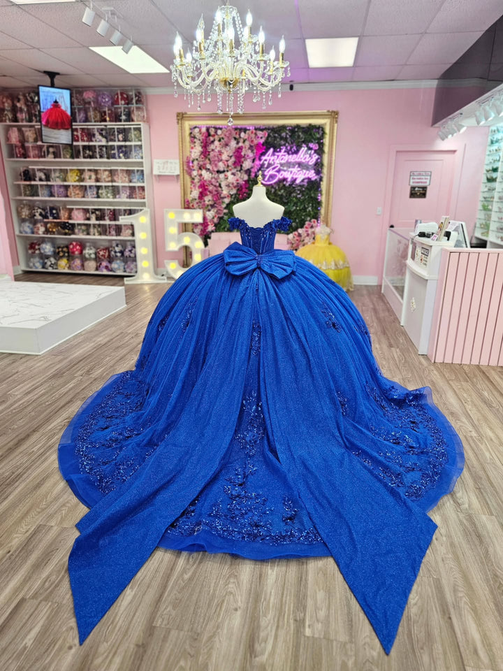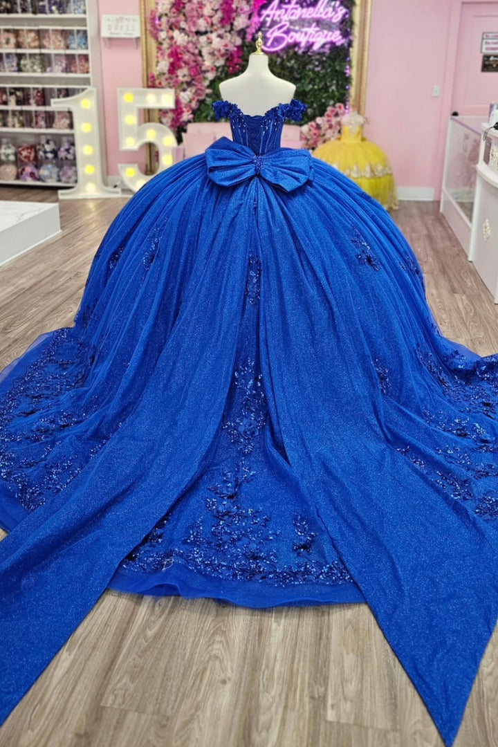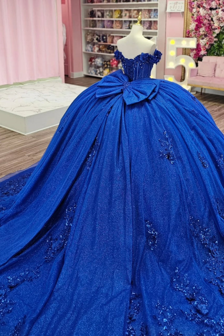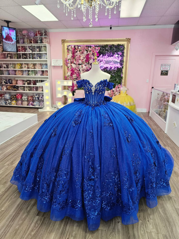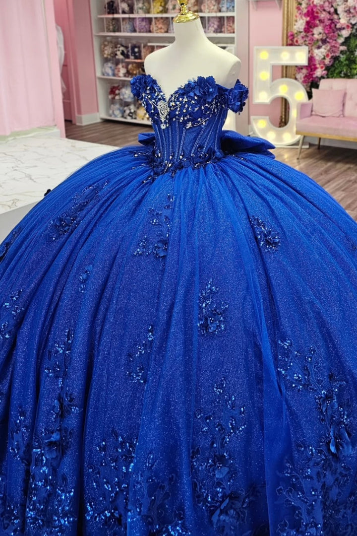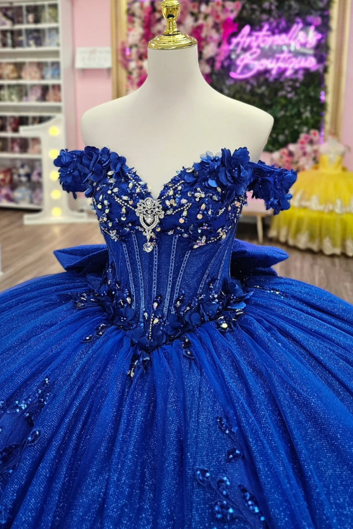 Description: This stunning royal blue quinceañera dress features an off-shoulder, sleeveless design that beautifully frames the neckline. Adorned with delicate 3D flower appliques and a charming bow knot, it offers a perfect balance of elegance and youthful charm. Ideal for a sweet 15 celebration, the dress ensures both style and comfort, making your special day unforgettable.