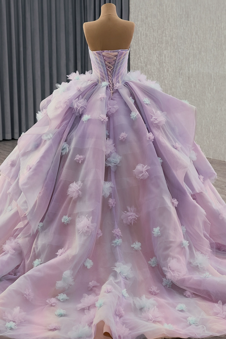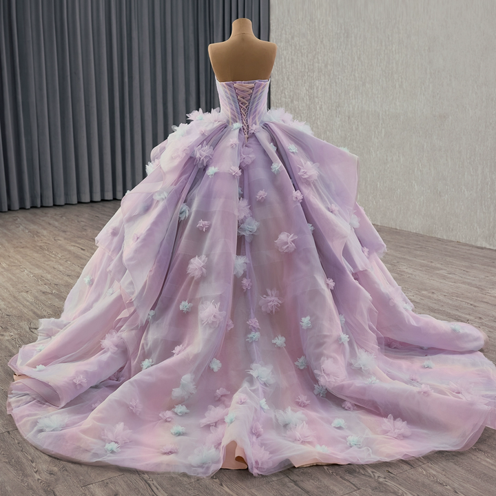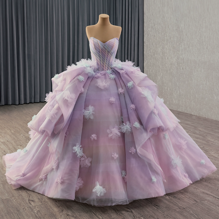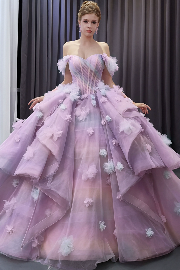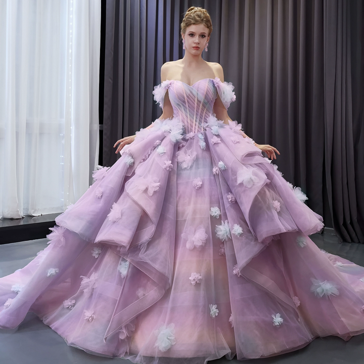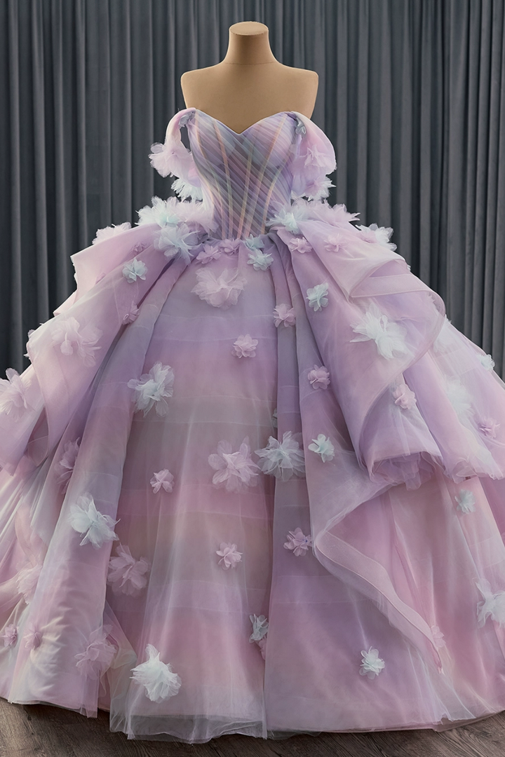 Description: Step into your quinceañera celebration wearing this ethereal lilac gown that exudes timeless sophistication. The graceful off-shoulder design elegantly exposes your shoulders while the sleeveless silhouette maintains a refined, modern aesthetic. Three-dimensional floral appliqués adorning the bodice create striking visual interest and textural depth, elevating the dress beyond ordinary formal wear. Voluminous ruffles sweep across the skirt, adding romantic movement and dimension that captures attention with every twirl. Expertly tailored for both comfort and impact, this dress embodies the perfect balance of youthful beauty and elegant poise for your unforgettable Sweet 15 moment.
