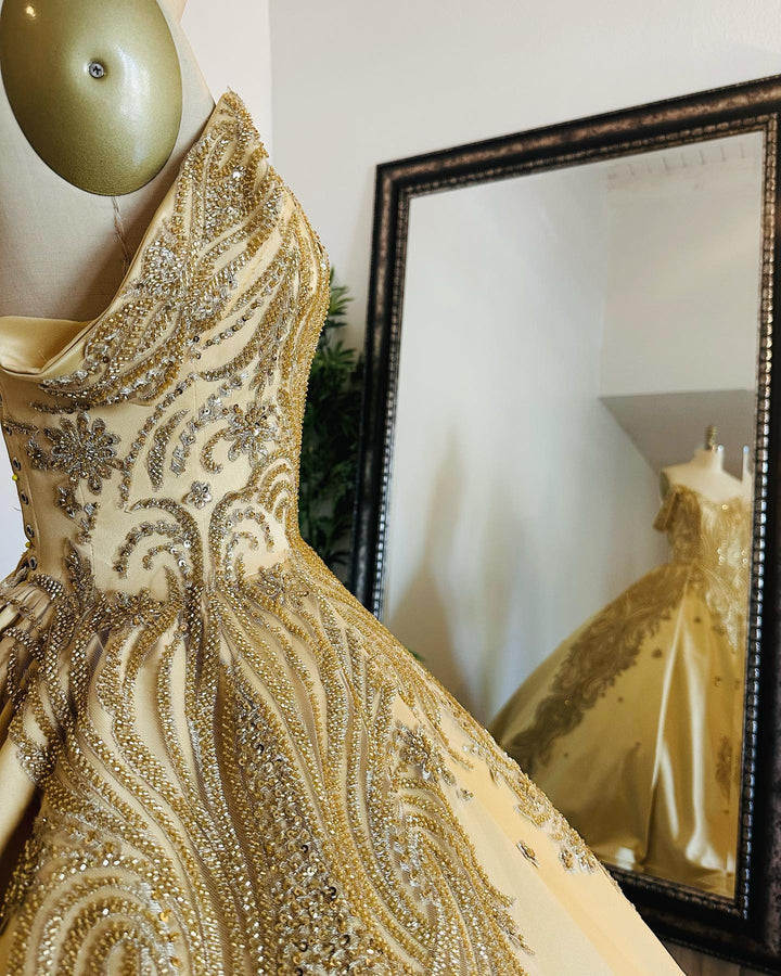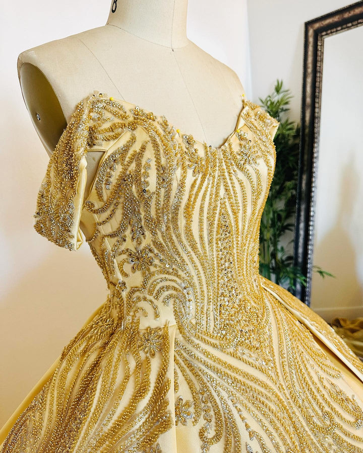 Luxuriöse Quinceanera-Kleider aus goldenem Satin, schulterfrei, herzförmiger Ausschnitt, Perlen, glitzernde Pailletten, Ballkleid für formelle Abendkleider