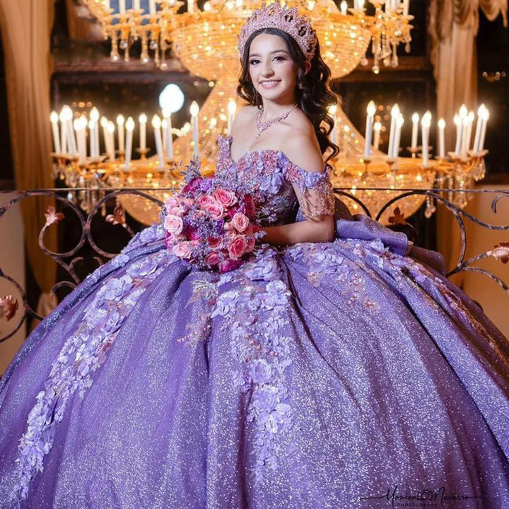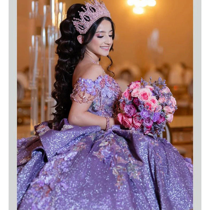 Luxuriöse lila Quinceanera-Kleider mit schulterfreiem Ausschnitt und 3D-Blumenapplikationen, Spitze, abgestufte Rüschen, süße 15./16. Geburtstagsparty, Ballkleider